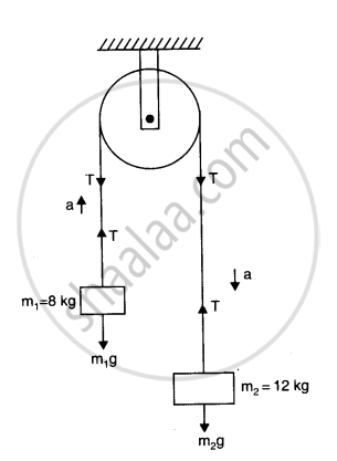 Two masses 8 kg and 12 kg are connected at the two ends of a light, inextensible string that goes over a frictionless pulley. Find the acceleration of the masses, and the tension in the string when the masses are released.