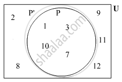 U = {1, 2, 3, 7, 8, 9, 10, 11, 12} P = {1, 3, 7, 10} तर U, P आणि P' वेन आकृतीने दाखवा. (P')' = P याचा पडताळा घ्या. - Mathematics 1 - Algebra [गणित १ - बीजगणित]