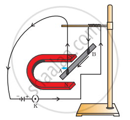 एक करंट ले जाने वाली छड़ AB अपनी लंबाई और चुंबकीय क्षेत्र के लंबवत बल का अनुभव करती है।
