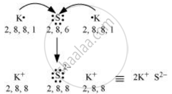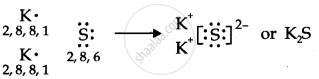Sulphur (S) requires 2 more electrons to complete its octet. Potassium (K) requires one electron more than the nearest noble gas i.e., Argon. Hence, the electron transfer can be shown as: