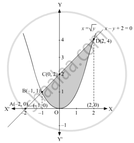 Using integration, find the area of the region bounded by the line x – y + 2 = 0, the curve x = \[\sqrt{y}\] and y-axis.