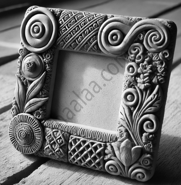 Here's an illustration of a hand-crafted photo frame made from natural soil, decorated with clay roll designs.