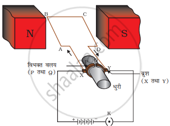 कार्य विधि: चित्र में दर्शाए अनुसार विद्युत धारा चालक ब्रुश X से होते हुए कुंडली ABCD में प्रवेश करती है तथा चालक ब्रुश Y से होते हुए बैट्री के दूसरे टर्मिनल पर वापस आ जाती है।
