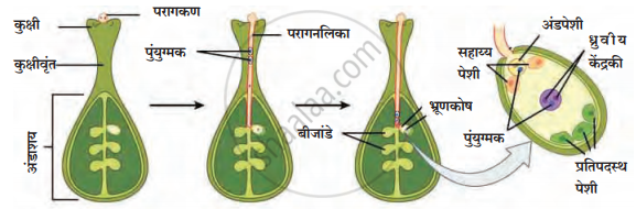 - दोन युग्मक वाहून नेणारी परागनलिका कुक्षीवृंतामार्गे बीजांडातील भ्रूण कोश पोहोचते. तिथे परागनलिकेचे अग्र फुटून पुंयुग्मक भ्रूण कोशामध्ये सोडले जातात.