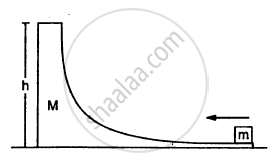 Figure shows a small body of mass m placed over a larger mass M whose surface is horizontal near the smaller mass and gradually curves to become vertical. The smaller mass is pushed on the longer one at a speed v and the system is left to itself. Assume that all the surface are frictionless. (a) Find the speed of the larger block when the smaller block is sliding on the vertical part. (b) Find the speed of the smaller mass when it breaks off the larger mass at height h. (c) Find the maximum height (from the ground) that the smaller mass ascends. (d) Show that the smaller mass will again land on the bigger one. Find the distance traversed by the bigger block during the time when the smaller block was in its flight under gravity.
