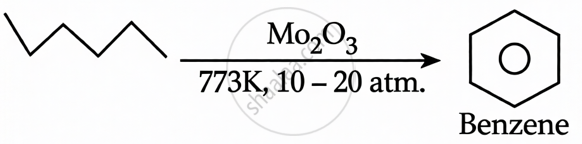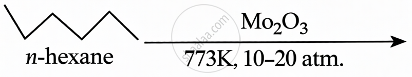 n-hexane + Mo2O3(773 K, 10-20 atm.): This is catalytic reforming (aromatization). n-hexane undergoes cyclization and dehydrogenation to form benzene.