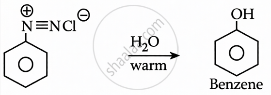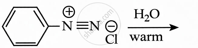 Benzene Diazonium Chloride + H2O (warm): When benzene diazonium chloride is warmed with water, it undergoes hydrolysis to produce phenol (C6H5OH), nitrogen gas, and HCl.