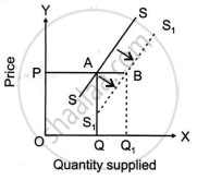 When supply of a commodity rises due to factors other than price of the commodity, it is called increase in supply. This is shown in the diagram. In the figure, SS is the original supply curve. At price OP, the quantity supplied is OQ. Now when supply increases, supply curve shifts, to the right as S1S1. Producers are now willing to supply more, i.e., OQ1 at the same price of OP.