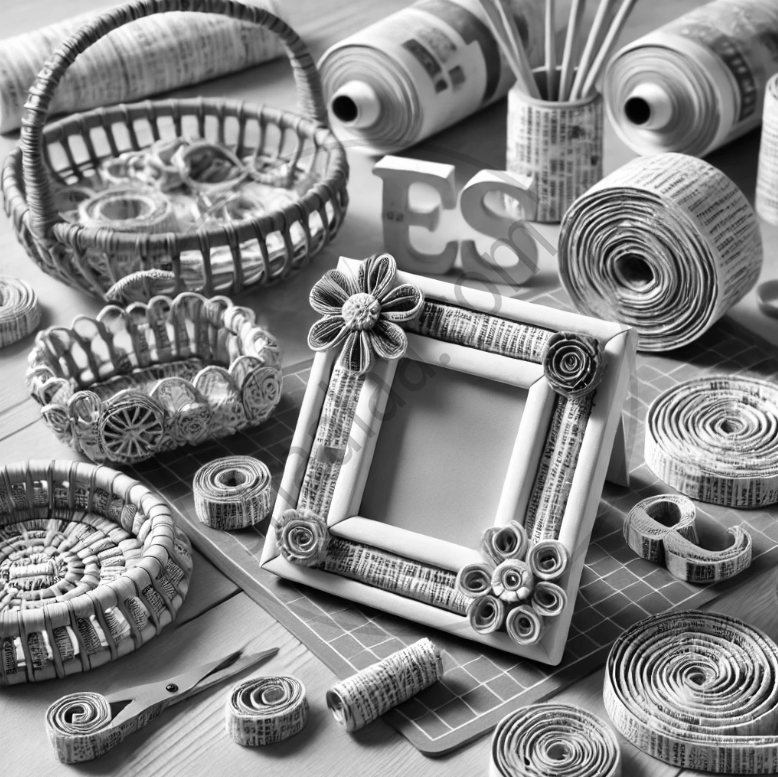 Here's an illustration of creative newspaper crafts, including a photo frame, woven basket, spiral mat, and decorative letters made by rolling newspaper tubes. These eco-friendly designs are perfect for artistic and sustainable craft projects!