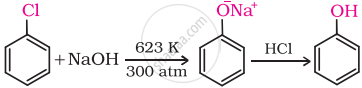 Chlorobenzene is fused with NaOH at 623K and 320 atmospheric pressure. Phenol is obtained by acidification of sodium phenoxide so produced.