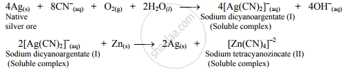 Write the reactions involved in extraction of silver from its ore by leaching process.