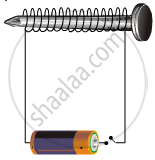 The long, insulated copper wire is first wound on the iron nail. Then the two free ends of the wire are connected to the battery and the switch as shown. Now that the switch is turned on, current flows through the circuit. Due to this flow of current, the insulated copper wire and iron nail act as an electromagnet. Now, if iron pins are brought close to this set-up, they stick to the iron nail.