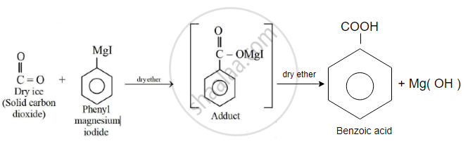 When the solution of phenyl magnesium iodide in dry ether is added to dry ice ( solid CO2 ), it gives a complex (magnesium salt of carboxylic acid), which on acid hydrolysis gives benzoic acid.