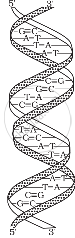 Two nucleic acid chains are wound about each other and held together by hydrogen bonds between pairs of bases. The two strands are complementary to each other because the hydrogen bonds are formed between specific pairs of bases.