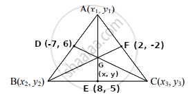 यदि D(-7, 6), E(8, 5) और F(2, -2) त्रिभुज की भुजाओं के मध्य बिंदु हों तो उस त्रिभुज के केंद्रक बिंदु के निर्देशांक ज्ञात कीजिए।