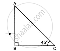 A ray of light passes through a right-angled prism as shown in the figure. State the angles of incidence at the faces AC and BC.