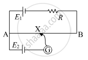 In the circuit diagram given below, AB is a uniform wire of resistance 15 Ω and length 1 m. It is connected to a cell E1 of emf 2V and negligible internal resistance and a resistance R. The balance point with another cell E2 of emf 75 mV is found at 30 cm from end A. Calculate the value of R.