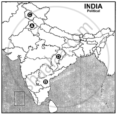 In the given Political outline map of India, four states have been marked as (A), (B), (C) and (D). Identify these states on the basis of the information given below and write their correct names in your answer book along with the respective serial numbers of the information used and the concerned alphabets shown in the map as per the format that follows: