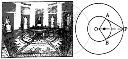 In a circular museum hall of radius 14 m, some statues are displayed. Statues are kept inside the inner concentric circle of radius 7 m. One such statue lying in sector OAB, is fenced along line segments OA, AP, PB and BO where P is a point on outer circle.