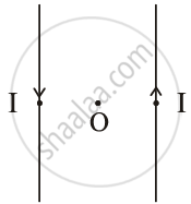 Draw the pattern of the magnetic field lines for the two parallel straight conductors carrying current of the same magnitude ‘I’ in opposite directions, as shown. Show the direction of the magnetic field at a point O, which is equidistant from the two conductors. (Consider that the conductors are inserted normal to the plane of a rectangular cardboard.)