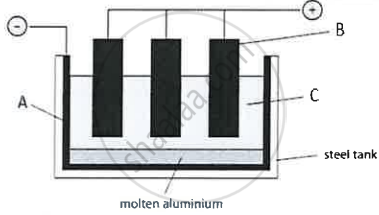 Given below in column A is a schematic diagram of the electrolytic reduction of alumina. Identify the parts labelled as A, B and C with the correct options from the Column B.