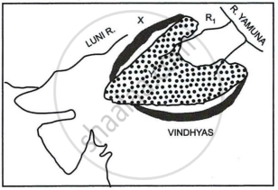 2. Name the mountain range marked X, the river marked R1 and the type of rock that constitutes the dotted region.