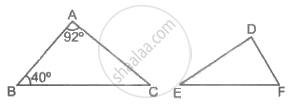 If ΔABC ∼ ΔDEF such that ∠A = 92° and ∠B = 40°, then ∠F = ?