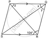 In the rhombus PQRS, ∠QRS = 104°. Find x, y and z.