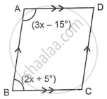 In the parallelogram ABCD, ∠A = (3x – 15)°, ∠B = (2x + 5)°. Find the values of x and ∠D.