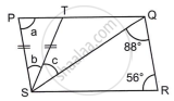 In the parallelogram PQRS, PS = TS. ∠SQR = 88°, ∠R = 56°. Find angles a, b, c.