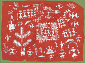 खालील दिलेल्या चित्राचे निरीक्षण करून पुढील मुद्यांच्या आधारे वारली चित्रकलेविषयी माहिती लिहा:
