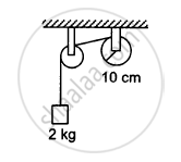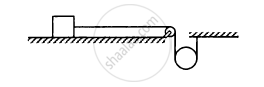 The descending pulley shown in the following figure has a radius 20 cm and moment of inertia 0⋅20 kg-m2. The fixed pulley is light and the horizontal plane frictionless. Find the acceleration of the block if its mass is 1⋅0 kg.