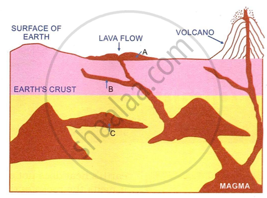 Study the picture. Identify the rocks formed in the case of A, B, and C. Give reasons to support your answer.