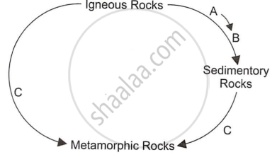 A: action of agents of weathering B: deposition-sedimentation C: action of heat and pressure