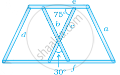 Iron rods a, b, c, d, e and f are making a design in a bridge as shown in the following figure, in which a || b, c || d, e || f. Find the marked angles between