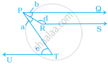 In the following figure, PQ, RS and UT are parallel lines. If c = 57° and `a = c/3`, find the value of d.