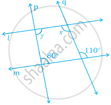 In the following figure, two parallel lines l and m are cut by two transversals p and q. Determine the values of x and y.