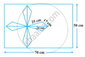 50 cm × 70 cm विमाओं वाली एक आयताकार टाइल पर, निम्नलिखित आकृति में दर्शाए अनुसार एक डिज़ाइन बनाया जाता है। इस डिज़ाइन में 8 त्रिभुज हैं, जिनमें से प्रत्येक की भुजा 26 cm, 17 cm और 25 cm की हैं। डिज़ाइन का पूर्ण क्षेत्रफल ज्ञात कीजिए तथा टाइल के शेष भाग का क्षेत्रफल भी ज्ञात कीजिए।