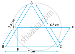 निम्नलिखित आकृति में, ∆ABC की भुजाओं में AB = 7.5 cm, AC = 6.5 cm और BC = 7 cm है। आधार BC पर एक समांतर चतुर्भुज DBCE की रचना की जाती है, जो क्षेत्रफल में ∆ABC के बराबर है। इस समांतर चतुर्भुज की ऊँचाई DF ज्ञात कीजिए।