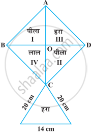 निम्नलिखित आकृति में दी हुई पतंग को बनाने के लिए प्रत्येक शेड (रंग) के कितने कागज की आवश्यकता होगी, यदि ABCD विकर्ण 44 cm वाला एक वर्ग है।
