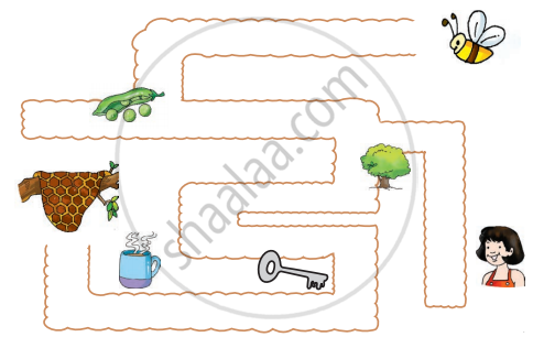 Help the bee to reach its home. What are the things that it met on the way that rhyme with a bee?