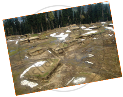 इस चित्र को देखो। क्या इसमें कुछ घर पहचान पा रहे हो? ये लकड़ी और मिट्टी के घर हैं जिनमें सर्दियों में कोई नहीं रहता। गर्मियों में बकरवाल लोग यहाँ रहने आते हैं जब वे बकरियों को चराने के लिए पहाड़ों की उँचाइयों पर ले जाते हैं।