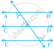 आकृति में, यदि AB || CD, CD || EF और y : z = 3 : 7 है, तो x का मान ज्ञात कीजिए।