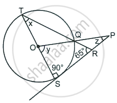 In the figure given below, O is the center of the circle and SP is a tangent. If ∠SRT = 65°, find the value of x, y and Z.