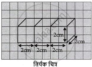 2 cm किनारों वाले तीन घनों को परस्पर सटा कर रखते हुए एक घनाभ बनाया गया है। इस घनाभ का एक तिर्यक अथवा एक समदूरिक चित्र खींचिए।