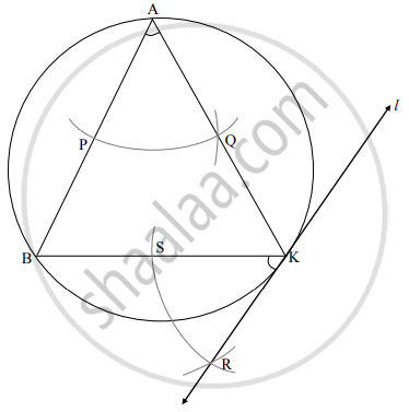 - K केंद्र घेऊन आणि कंपासमध्ये तेच अंतर ठेवून वर्तुळाची जीवा BK ला S या बिंदूत छेदणारा कंस काढा.