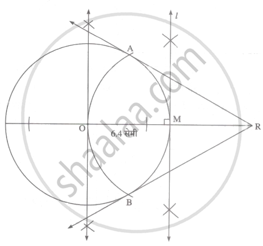 6.4 सेमी व्यासवाला एक वृत्त खींचिए। वृत्त के केंद्र से वृत्त के माप के बराबर दूरी पर एक बिंदु R लीजिए। इस बिंदु से वृत्त की स्पर्श रेखाएँ खींचिए।