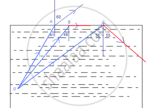 (i) Fig. shows three rays of light OA, OB and OC passing from water to air, making angles 490, 410 and 350 with the horizontal surface respectively. Draw an approximate path of the emergent ray for each. (Critical angle of water is 490.)