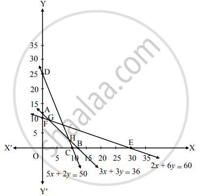| 5x + 2y ≤ 50 | 5x + 2y = 50 | `x/(10) + y/(25)` = 1 | C 10, 0) D (0, 25) |