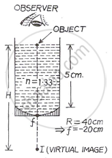 A concave mirror has a radius of curvature of 40 cm. It is at the bottom of a glass that has water filled up to 5 cm (see figure). If a small particle is floating on the surface of water, its image as seen from directly above the glass is at a distance d from the surface of water. The value of d is dose to: (Refractive index of water = 1.33)